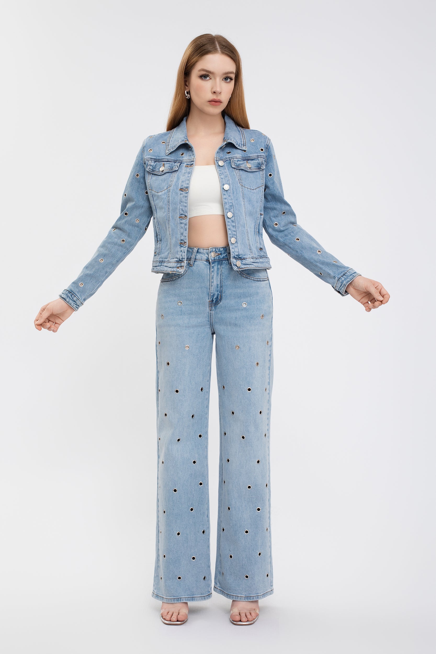 Il jeans con borchie da donna è pensato per chi vuole unire comodità e carattere in un unico capo. Realizzato in denim elasticizzato, offre una vestibilità confortevole con vita media, cinque tasche e una gamba ampia dritta. Le borchie decorative aggiungono un tocco rock e grintoso al look, ideale per boutique che vogliono proporre capi audaci ma raffinati. La chiusura con cerniera e bottone metallico completa il design, rendendolo perfetto per outfit da giorno con personalità.