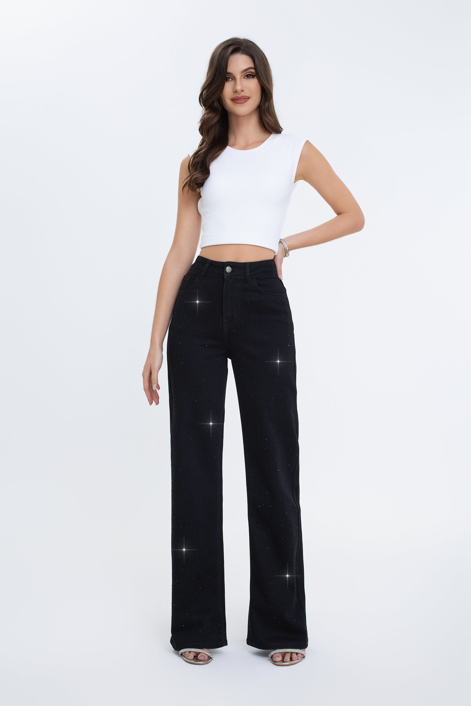 Il jeans con brillantini neri da donna è un capo sofisticato, perfetto per chi desidera uno stile discreto ma ricercato. Realizzato in denim elasticizzato, presenta una vita media e una gamba ampia dritta che valorizzano la figura offrendo comfort durante tutto il giorno. I brillantini tono su tono donano luminosità senza eccessi, rendendo questo jeans ideale per outfit eleganti ma rilassati. Completo di cinque tasche e chiusura con zip e bottone metallico.