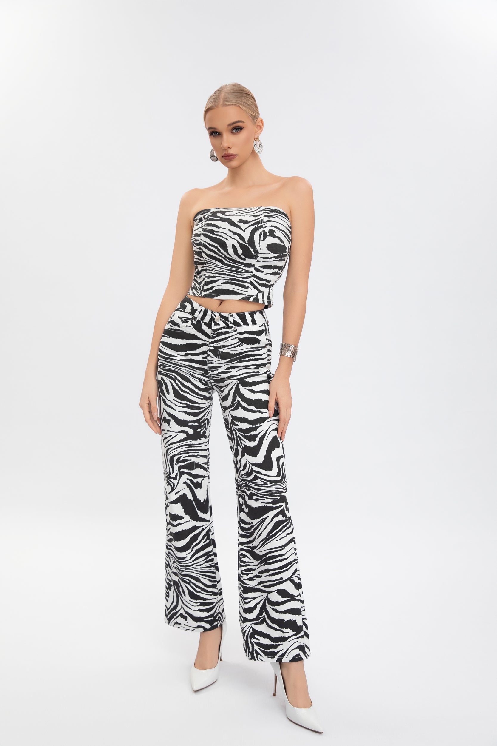 Il jeans zebrato da donna di Farfallina è un capo audace e originale, perfetto per chi ama distinguersi. Realizzato in denim elasticizzato, garantisce una vestibilità comoda grazie alla vita media e alla gamba ampia dritta, adattandosi facilmente a ogni silhouette. La fantasia zebrata aggiunge un tocco fashion e deciso, ideale per look di forte personalità. Completano il modello le cinque tasche funzionali e la chiusura con zip e bottone metallico.